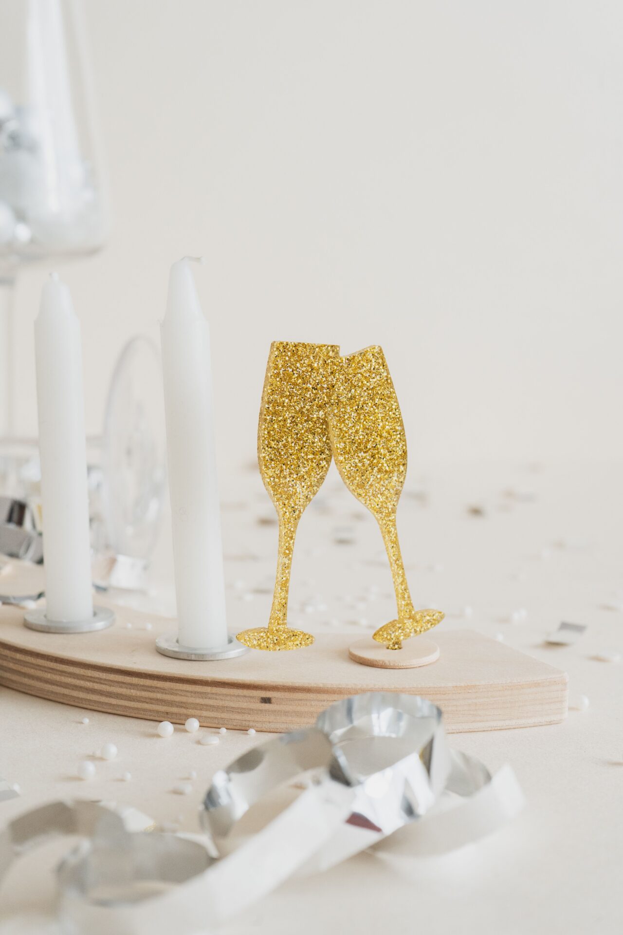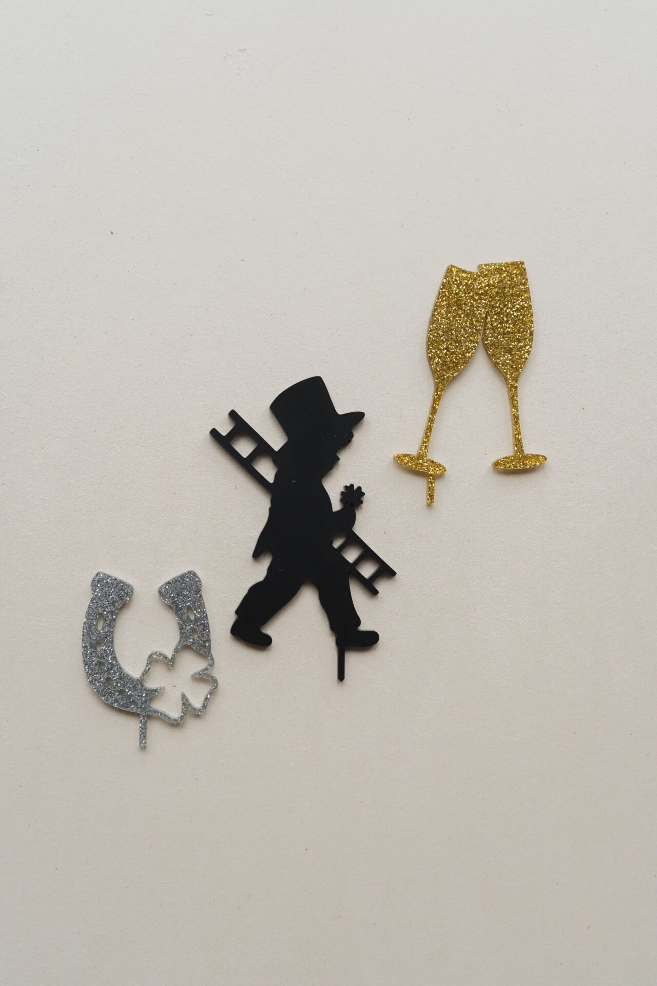 Wunderschönes Silvester Stecker Set für den Geburtstagskranz. Das Set besteht aus einem schwarzen Schornsteinfeger, goldenen Sektgläsern und einem silbernen Hufeisen.