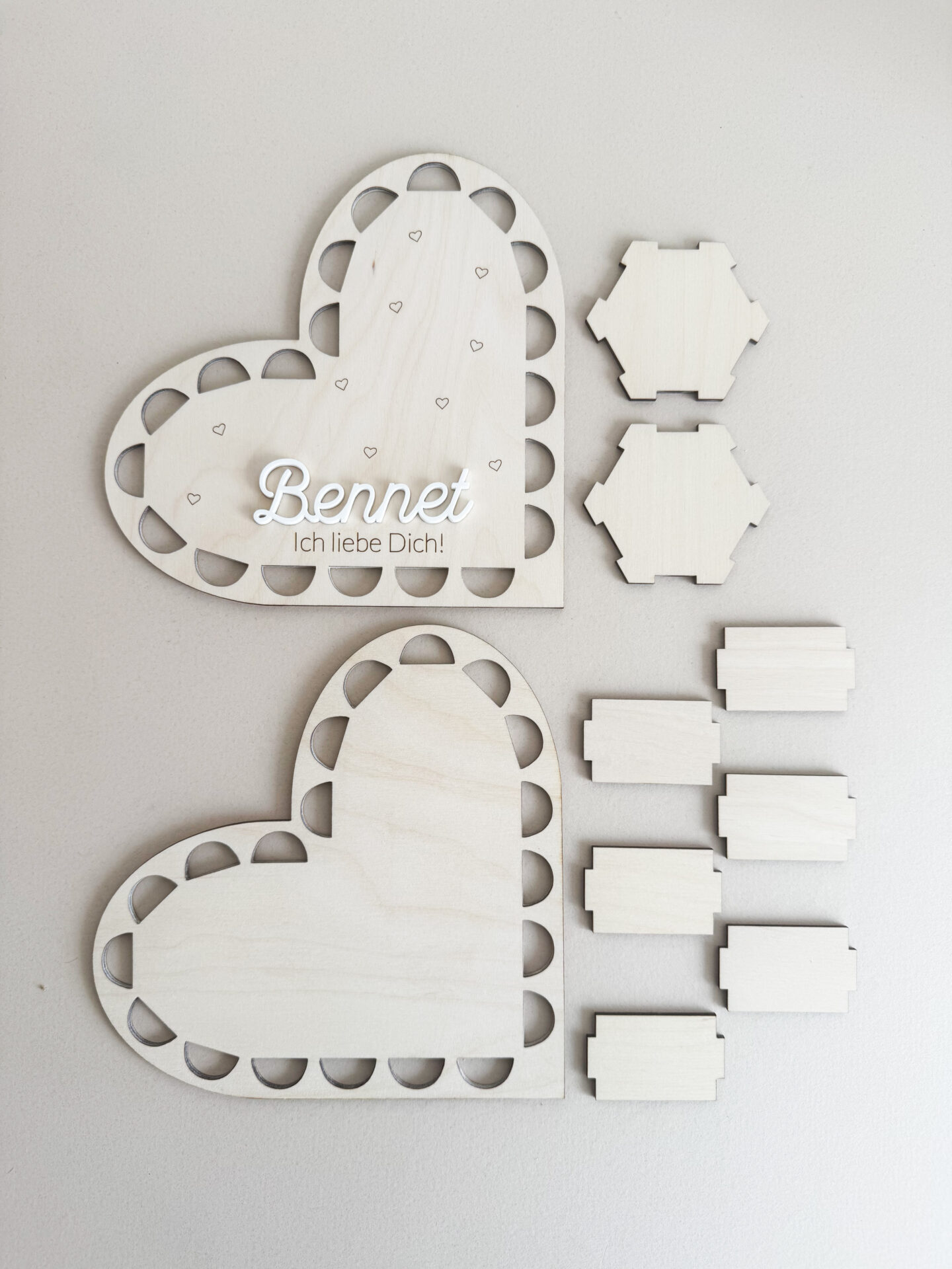 Das personalisierbare Holzherz besteht aus präzise gefertigten Einzelteilen aus hochwertigem Holz. Zu Hause ist der Zusammenbau kinderleicht: Einfach die Teile mit etwas Holzleim zusammenkleben, kurz trocknen lassen – und schon ist die perfekte Basis für dein persönliches Geschenk geschaffen. Bastelspaß und Vorfreude inklusive!