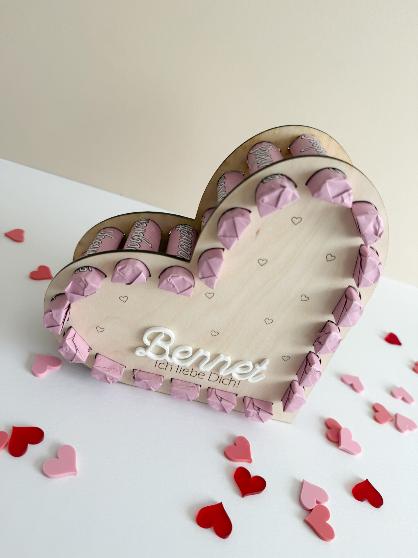 Im Anschluss wird das Herz ganz unkompliziert mit yogurette® Schokoladenriegeln befüllt und ist sofort bereit zum Verschenken. Die Kombination aus natürlichem Holz, persönlicher Gravur und süßer Überraschung macht dieses DIY Holzherz zu einer einzigartigen Geschenkidee.