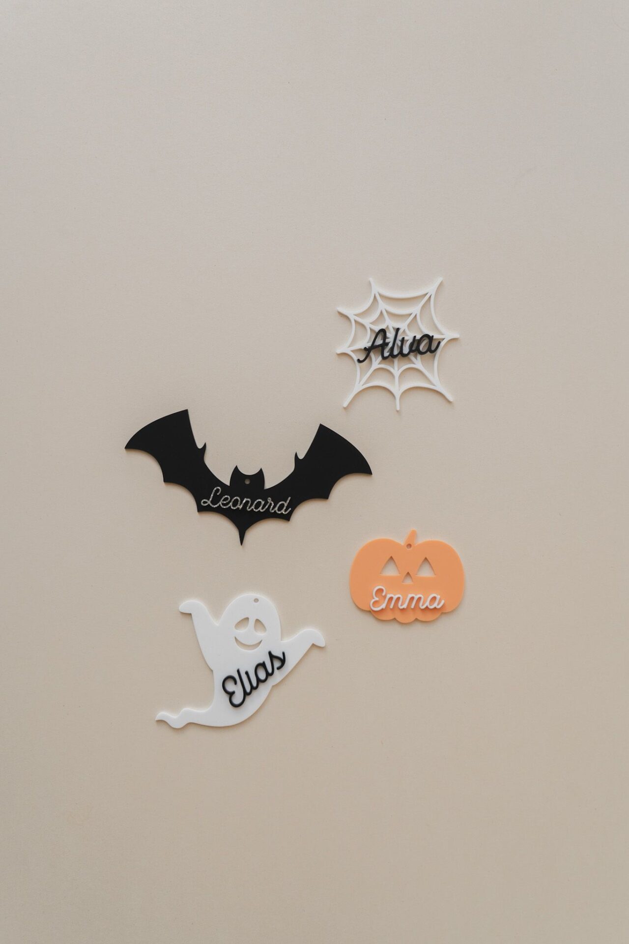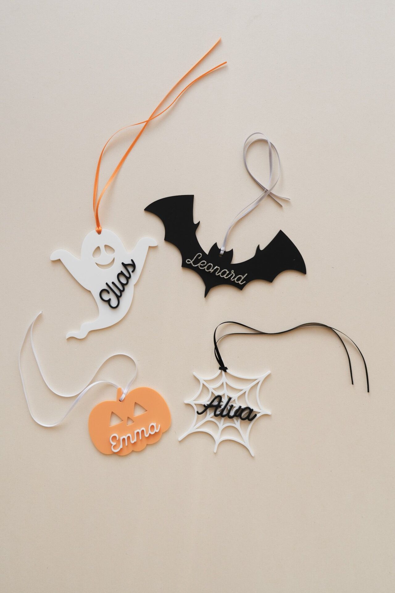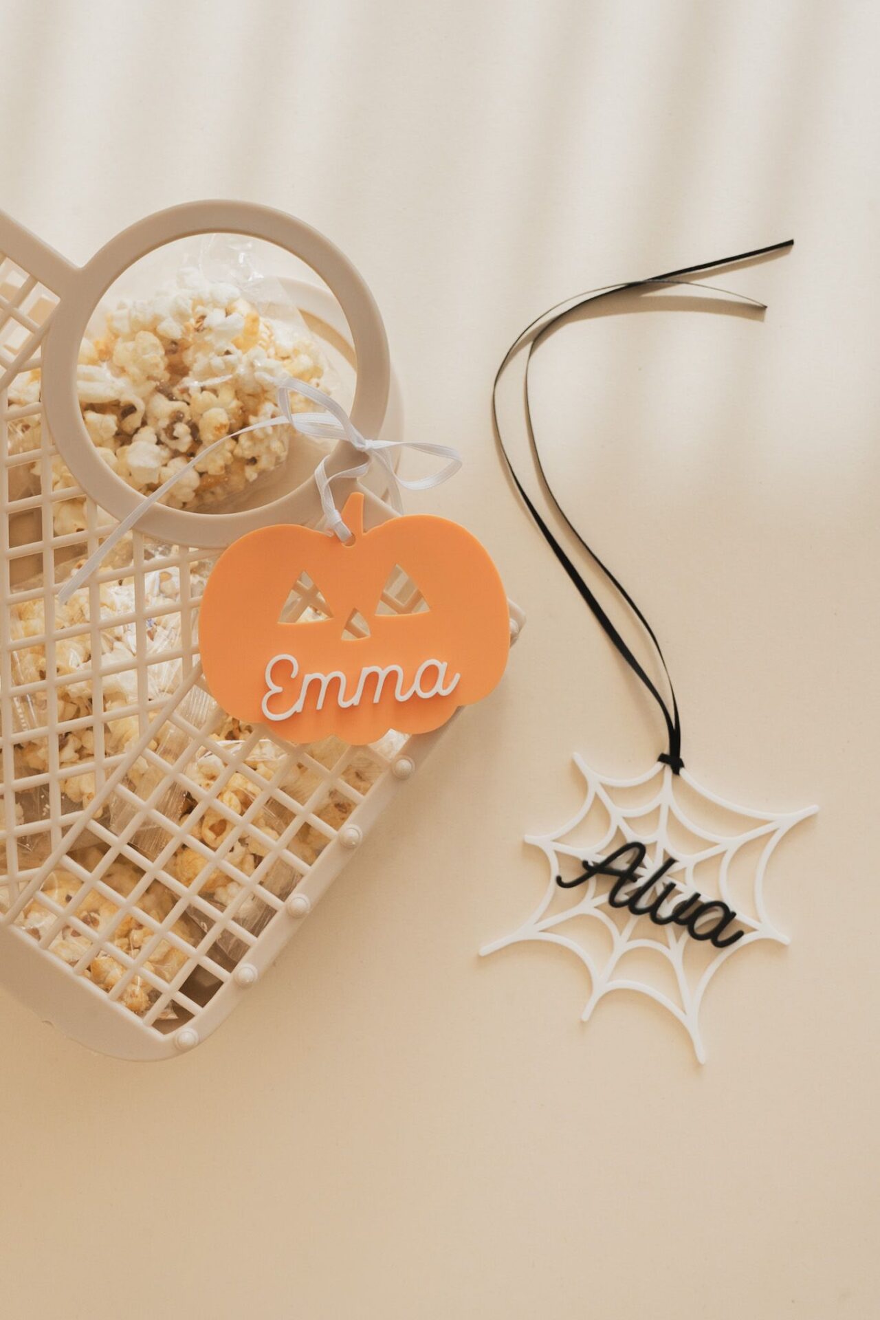 Unsere farbenfrohen Anhänger für einen Halloween Korb mit Namen machen das Körbchen unverwechselbar.