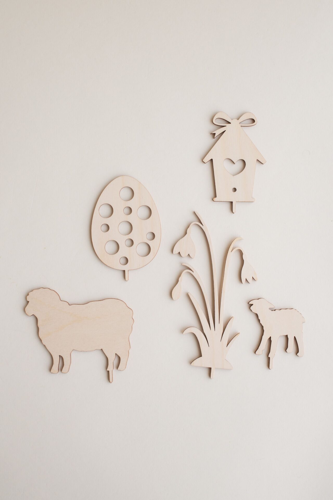 Alle Elemente sind so gestaltet, dass sie sich wunderbar in einen Holzkranz einfügen und eine warme, natürliche Osterdeko ergeben – perfekt für Tisch, Kommode oder Fensterbank.