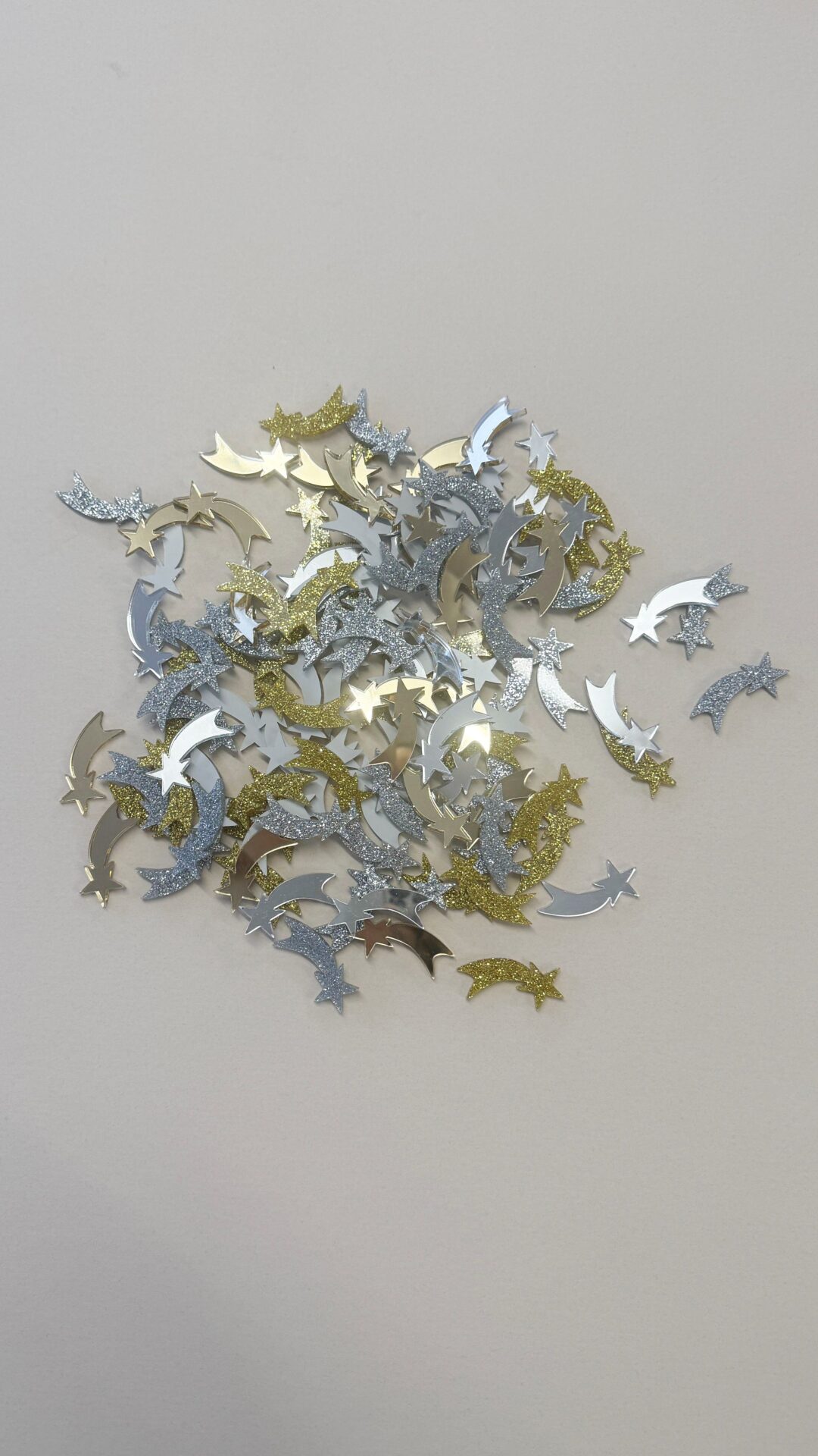 Möchtest du nachhaltiges Konfetti kaufen? Hier erhälst du einen bunte Streudeko Mix für deine Weihnachts- oder Silvesterparty bestehend aus Sternschnuppen in gold Glitzer und silber Glitzer und in silber und gold verspiegel (mit weißer Rückseite).